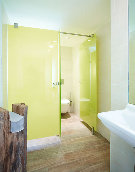 Die Narrizella Ratoldi entschieden sich bei der Farbwahl der Trennwaende für ein zartes lindgrün – harmonisch mit dem dunklen braun von Holzboden und dem weiss der Sanitären anlagen. Türen und Wände aus Verbundsicherheitsglas vsg sind konsequent rahmenlos und flächig ohne Bohrlöcher, Dank der innovativen Klemm-Beschläge. Neuartige Türdrehlager ermöglichen, dass die Türen einen beliebig zu versetzenden oberen und unteren Drehpunkt haben.